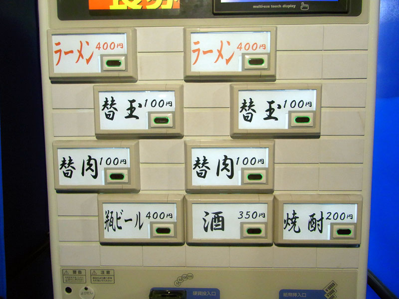 まずはお店に入る前に食券を購入します。メニューはラーメン、替玉、替肉、お酒類、以上です。ラーメンは400円で替え玉は100円です。安い!