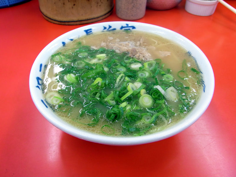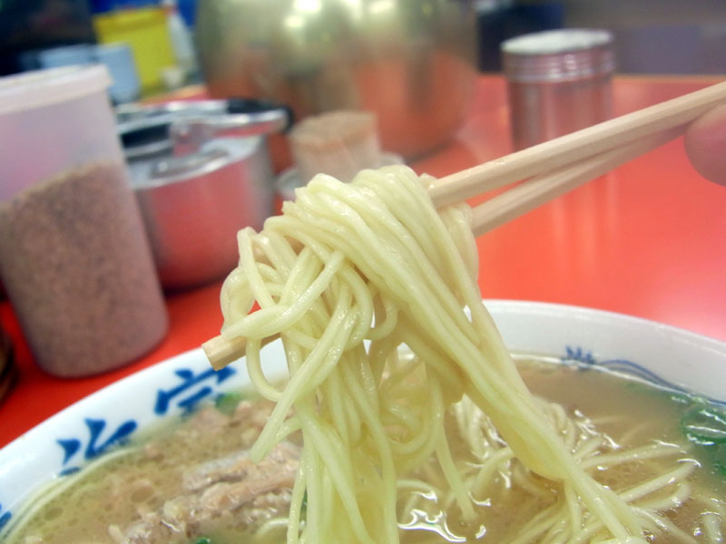 まずは見た目に脂の厚い層が浮いています。スープを一口飲むと長浜ラーメンの原点である長浜屋の昔の豚骨の味がします。アッサリとした豚骨スープに麺は細麺ストレート。茹で加減は若干柔めでしたが、これはこれで美味しかったです。