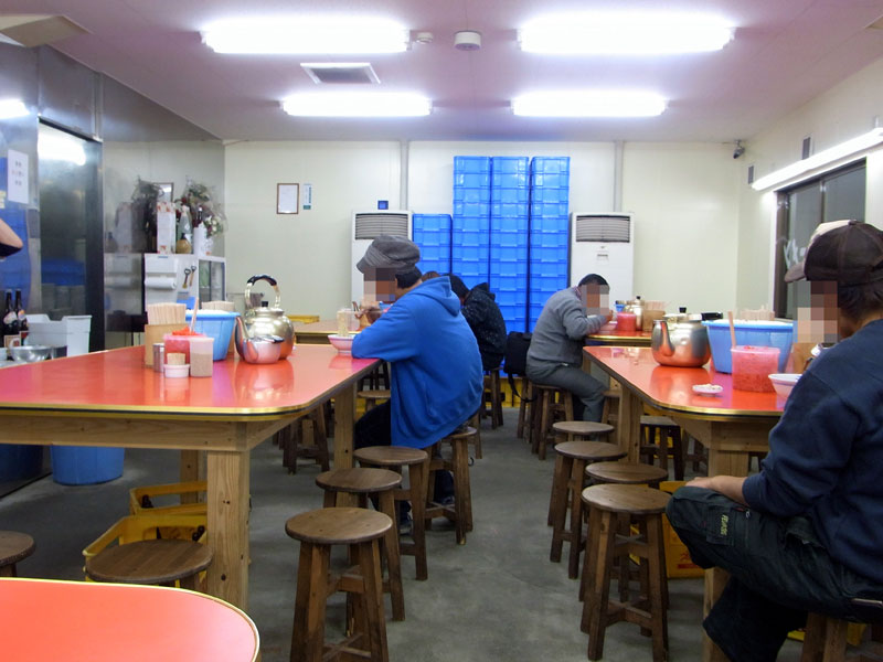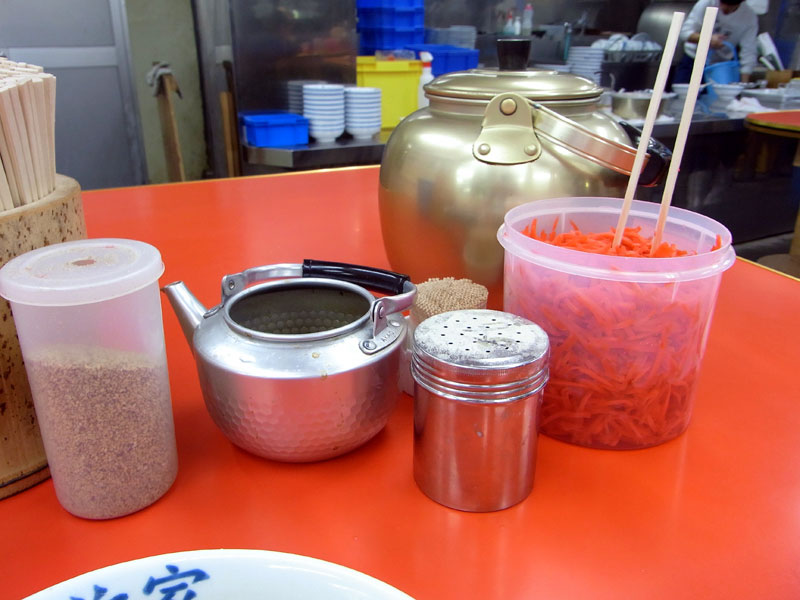 店内は赤いテーブルにを囲むように席があり、相席になることも普通の感じです。テーブルの上にはゴマ、胡椒、紅ショウガ、のトッ