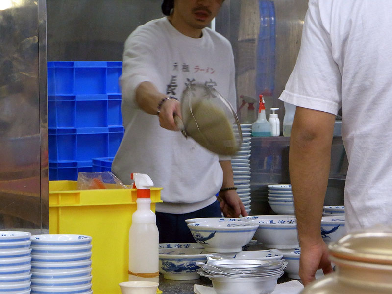 厨房内では麺を湯切りして丼に投入したり、スープを丼に小分けしている様子が見えました。