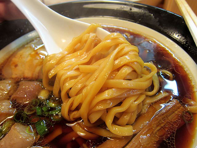麺は平打ちで若干硬めの茹で加減で、すこしウエーブがかかっています。