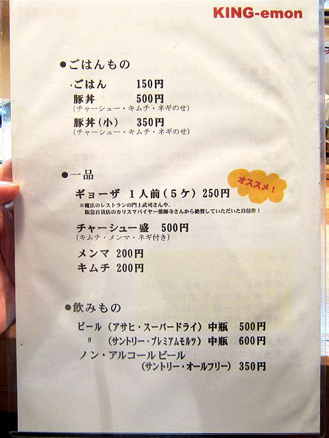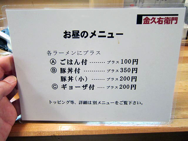 トッピングは、煮玉子50円、ネギ多め・メンマ多め100円、キムチ・キクラゲ100円、
