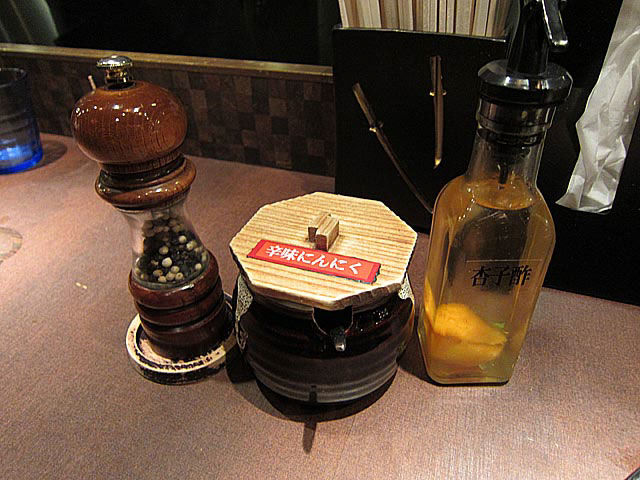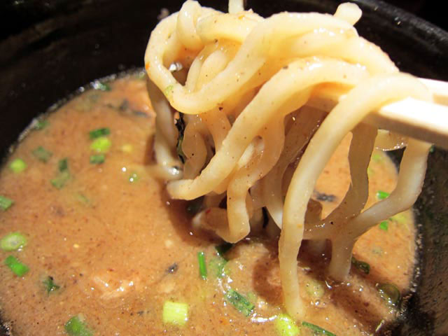 酸味のあるタイプではなく、どことなく甘みのあるつけ汁で、食べ続けると若干飽きがでてきますが、卓上の辛みニンニクや黒胡椒をミルでガリガリ入れて味の変化も楽しめます。