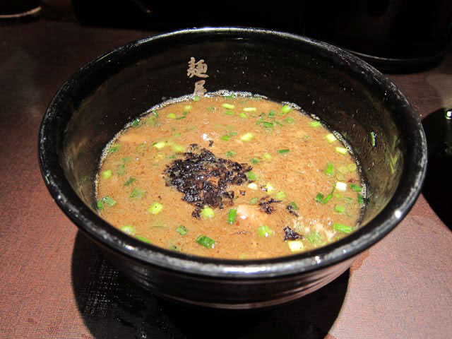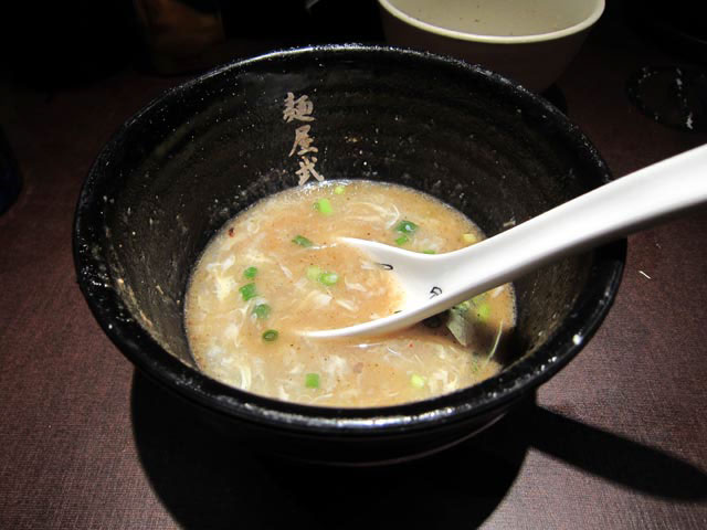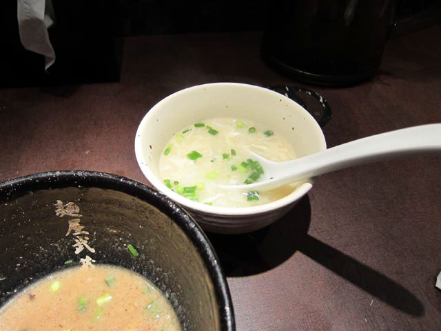 スープ自体にはほとんど味がついてなくて、つけ汁に注ぎ入れると、つけ汁の濃厚さがやわらいで、トロミが加わります。