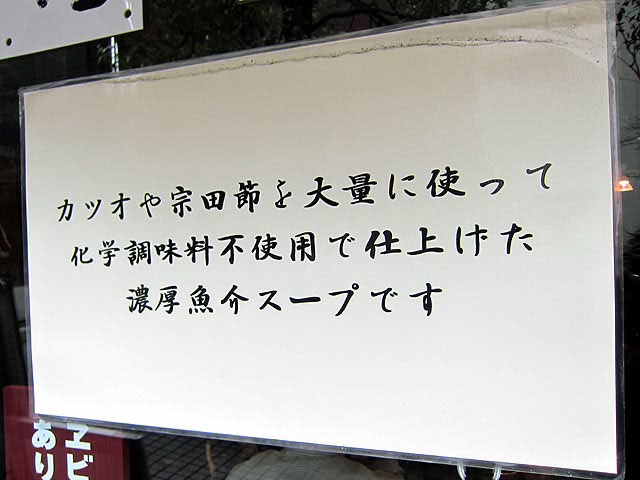 こちらのお店は無化調のようで、店頭には「カツオや宗田節を大量に使って化学調味料不使用で仕上げた濃厚魚介スープです」と書かれてます。これは体に良さそうだ♪