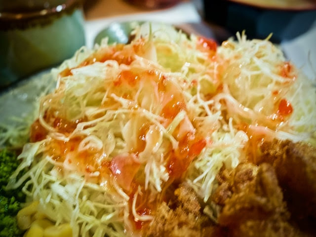 皿の脇には千切りのキャベツが大量に盛られてるので、野菜不足も心配無用だ。